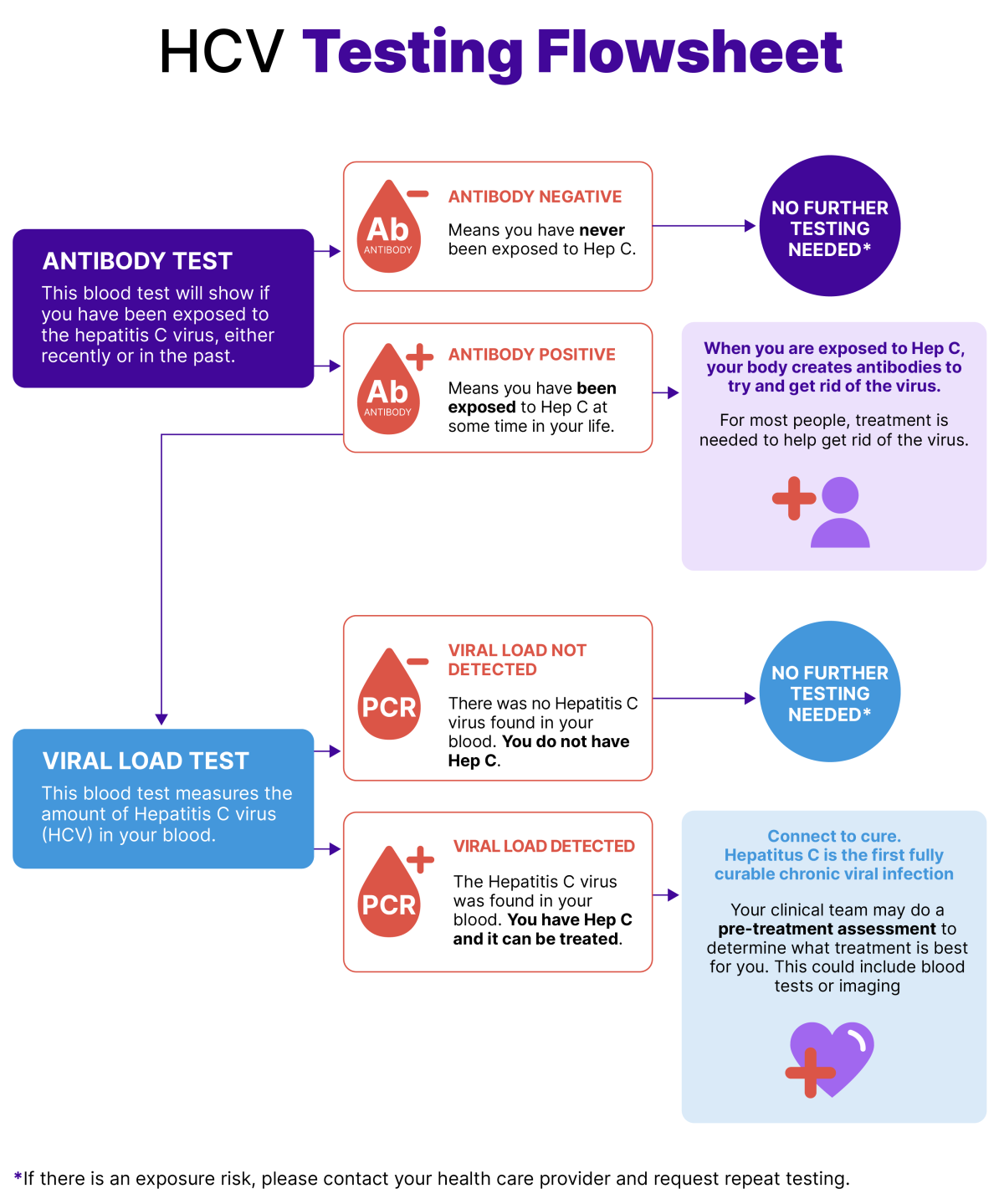 You should get a PCR test if you have ever tested positive for hepatitis C antibodies, even if you’ve been cured of hepatitis C before. If the virus is present, you have a hepatitis C infection. Hepatitis C can be treated and you can be cured. If the virus is present, your healthcare provider will work with you on a care plan for treatment and cure. Everyone should get tested at least once in their life. You can get tested again anytime you might have been exposed to the hepatitis C virus.